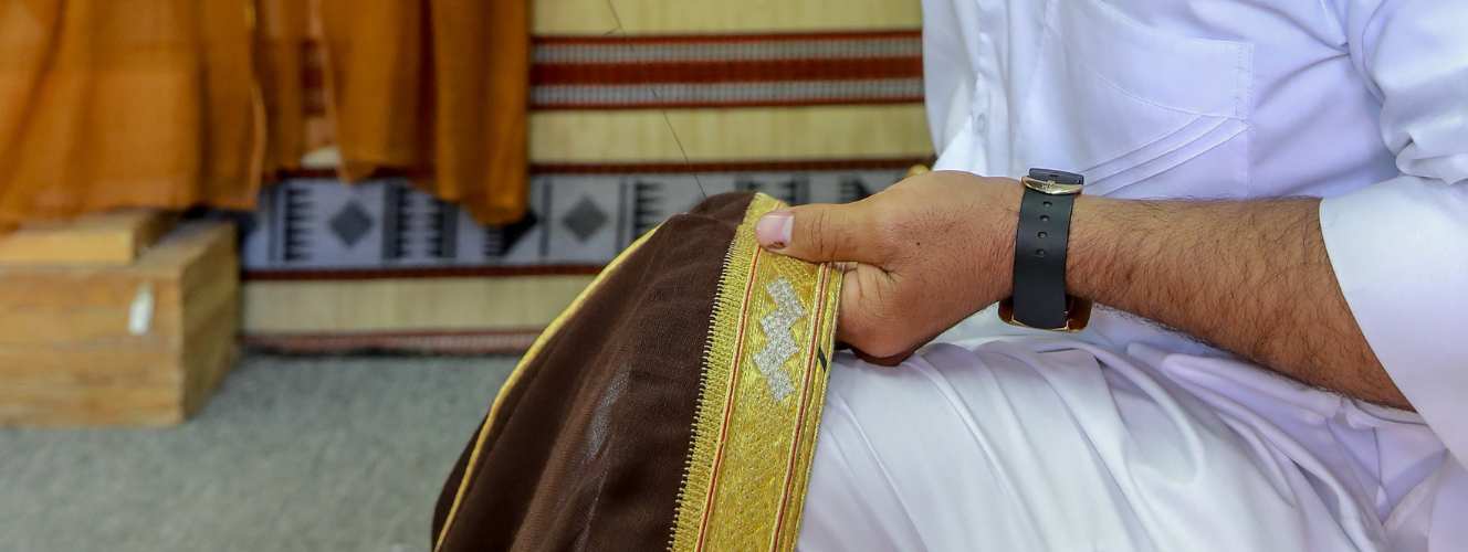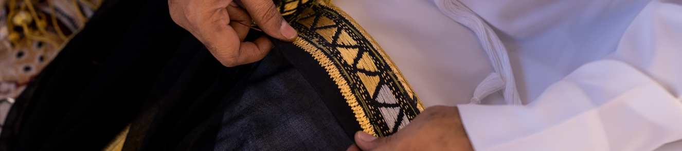 Traditional makers of bisht use camel hair and sheep wool, spinning and weaving them according to the type required. Summer bishts are fine and lightweight, while winter bishts are thicker and heavier. Fabric sources have diversified in recent years. Typically, white bishts are worn during the day and black ones at night. Historically, Emirati women also wore a similar garment known as suway’yah, placed over the head rather than the shoulders, draping down the body. It was made from fine fabric and specially adorned with gold-plated zari threads, particularly for brides.