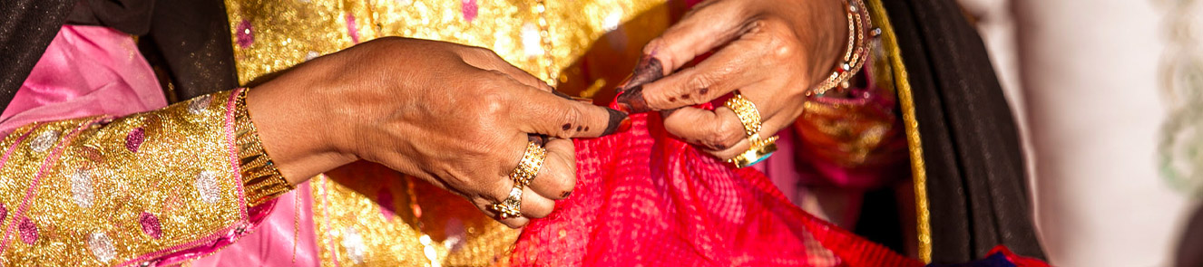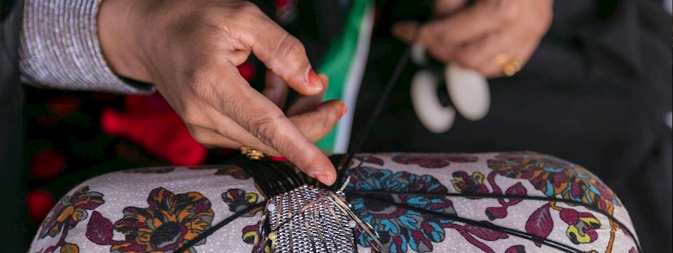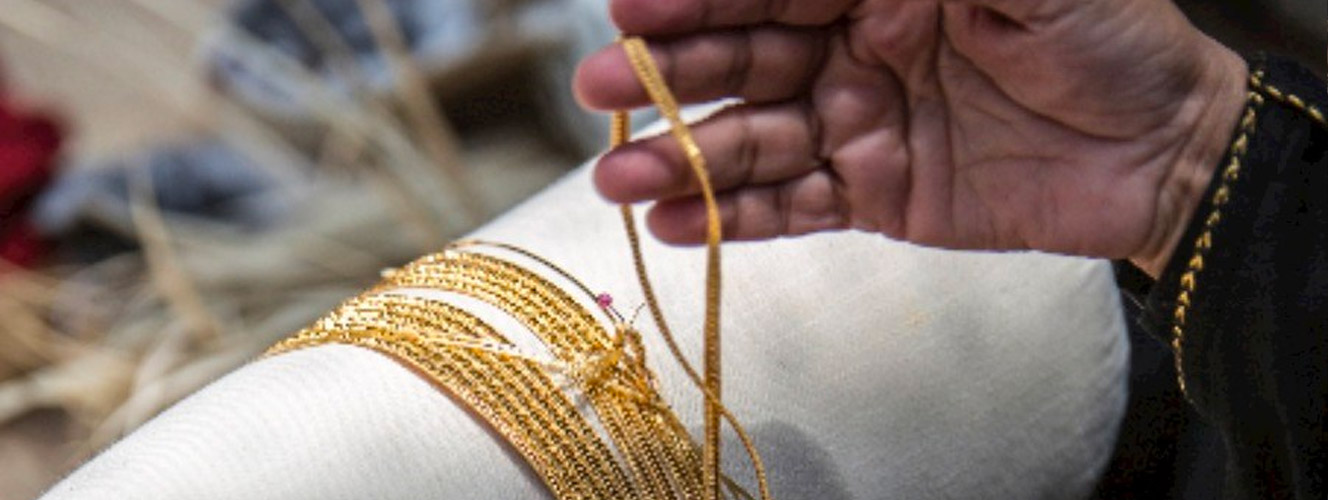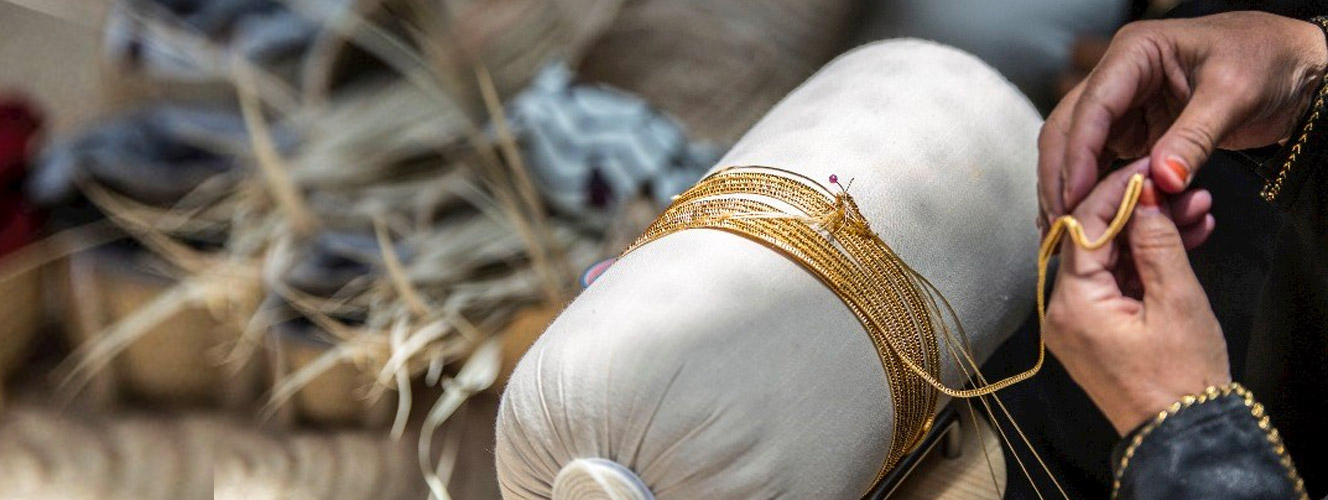 Talli is a traditional textile handicraft that features bright colours and beautiful designs. An element of cultural heritage in the United Arab Emirates, it decorates all types of women’s clothing – from wedding gowns and formal dresses to everyday wear. Talli is created by twisting and braiding different strands of thread together to create long, narrow strips of textile with fine, elaborate patterns. These skills have been passed down from mother to daughter for generations.