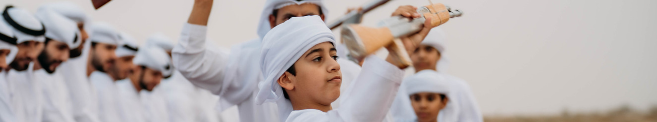 Is Al-Rafza popular? It is widespread in every segment of society and its practitioners are young and old alike. A public performance based on mass participation, parents encourage their children to perform Al-Razfa at events and gatherings – one of the reasons why the dance attracts so many participants. Children learn this heritage art through stimulation and gradual practice, as well as by watching the groups that perform Al-Razfa at social events such as weddings, festivals and anniversaries.